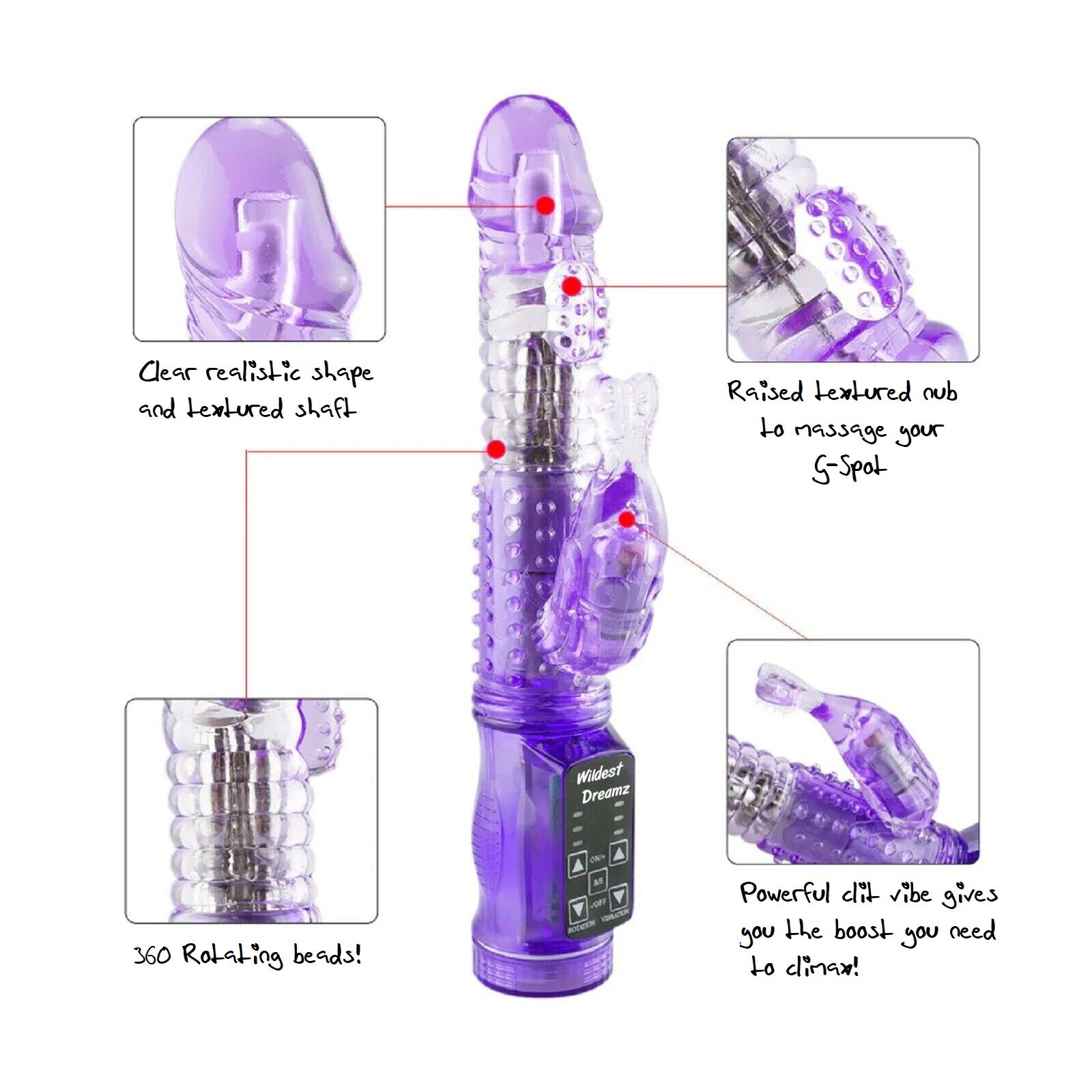 Experience mind-blowing blended orgasms with our powerful dual-action Rabbit Vibrator. Designed to hit all the right spots simultaneously, this toy features a targeted clitoral stimulator and a rotating shaft with stimulating beads to awaken your G-spot. Whether you want a gentle tease or intense pulsation, play around with the custom controls to find your perfect rhythm.